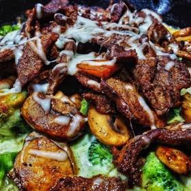 4) When there's 5 minutes left, dump the sirloin and shrooms on top of the broccoli , Little mozz on tip and return to oven .. ⠀
