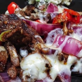 5) Fry the veggies while mixing around for about 10 minutes, throw in the steak, add some steak rub and garlic salt , mix to combine, fry for another few minutes , turn off heat, sprinkle some shredded mozzarella on top and let melt.